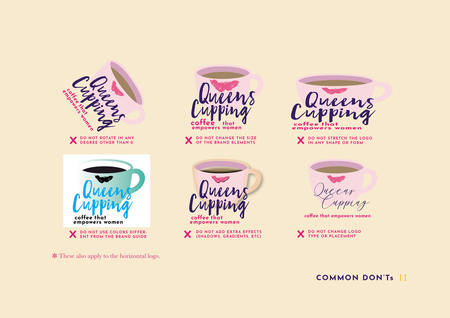 Business card consists of a large cup in Queens Cupping's signature pink color which is prevalent throughout the brand. The stamp marks are kiss marks which connects to the brand's logo, a pink cup with lipstick residue.